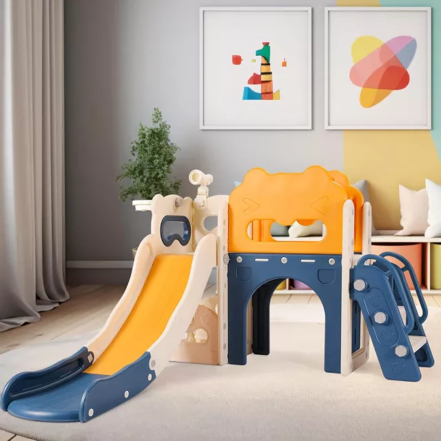 Turn your home or backyard into an exciting mini playground with the 6-in-1 Toddler Slide and Climber Playset in Blue Gray. Designed for curious and energetic toddlers, this all-in-one playset combines fun, fitness, and learning in a safe and imaginative way. With a long smooth slide, easy-to-climb steps, basketball hoop, telescope, hide-and-seek windows, and a built-in storage space, it keeps kids entertained while helping them grow strong and confident. Perfect for ages 1 to 3, this indoor and outdoor playset transforms playtime into an adventure every day.