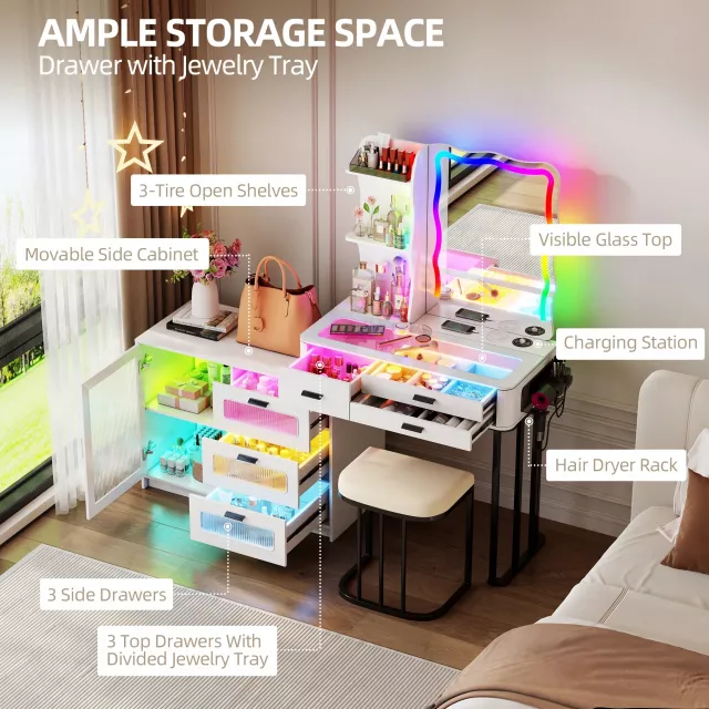 This vanity isn’t just beautiful—it’s smartly designed for your comfort and storage needs. With six spacious drawers, you can neatly organize your makeup, skincare, jewelry, and beauty tools. The glass top adds a touch of luxury while making it easy to see your favorite items at a glance. The mirror’s RGB light settings let you create the perfect ambiance—soft and warm for relaxation or bright and clear for flawless makeup application. Plus, the charging station keeps your phone, tablet, or beauty tools ready whenever you are.