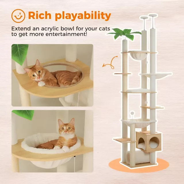 Designed to keep your cats entertained and active, this tower includes a spacious condo for restful privacy, a large and small hammock for lounging, and fun hanging & spring pompom balls to spark their playful instincts. With six sisal-covered scratching posts placed at different heights, your cats can stretch and scratch freely while keeping their claws healthy. Please note: the transparent acrylic nest shown in images is sold separately.