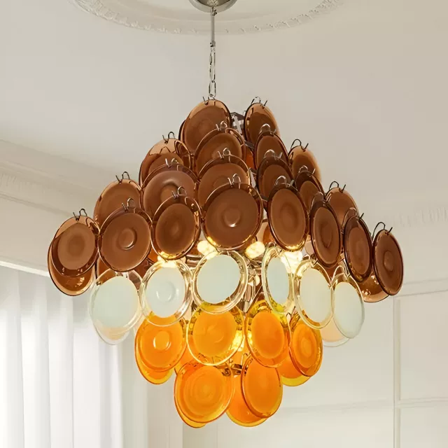 The soul of this piece lies in its handcrafted colorful glass shades. Inspired by traditional Murano glass artistry, each colorful shade is designed to create a stunning visual effect. When illuminated, the glass glows from within, casting beautiful colored light patterns across your walls and ceiling. The combination of vibrant colors with the sleek, polished chrome frame creates a perfect balance between artistic expression and sophisticated Art Deco design that feels both timeless and fresh.