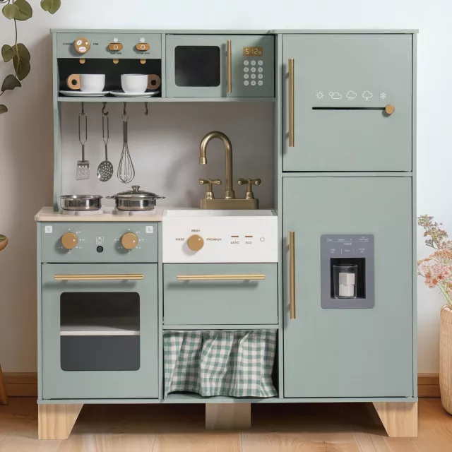 Featuring a thoughtful 90° corner design, this kitchen set fits perfectly into any playroom while offering plenty of space for multiple children to play together. The realistic stove, sink, oven, washing machine, microwave, and ice maker encourage imaginative role play and help kids learn real-world skills through fun, hands-on activity. Every detail is crafted to keep your child engaged and inspired.