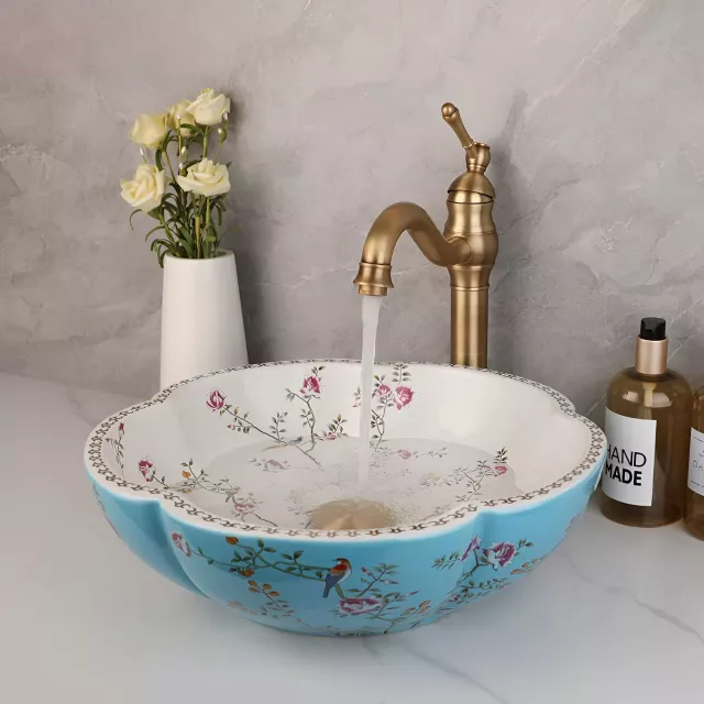 Transform your bathroom into a tranquil retreat with our Elegant Hand-Painted Blue and White Ceramic Vessel Sink with Faucet Set. This stunning washbasin features a beautiful floral and bird design that brings a touch of nature’s beauty into your home. The intricate hand-painted craftsmanship ensures that each piece is unique, making it more than just a functional sink—it’s a work of art that elevates your space.