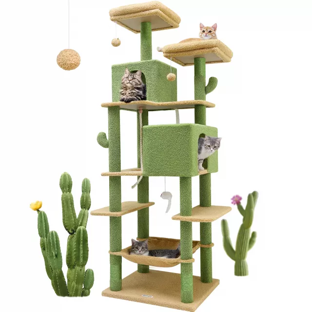 Give your feline friends the ultimate indoor playground with the 76-Inch Cactus Cat Tree Tower — a stunning blend of comfort, adventure, and style. Designed to resemble a lively cactus, this towering structure brings a splash of nature into your home while offering endless fun for your cats. Its lush green tones and unique cactus design create a calming, natural vibe that instantly enhances any room’s look.
