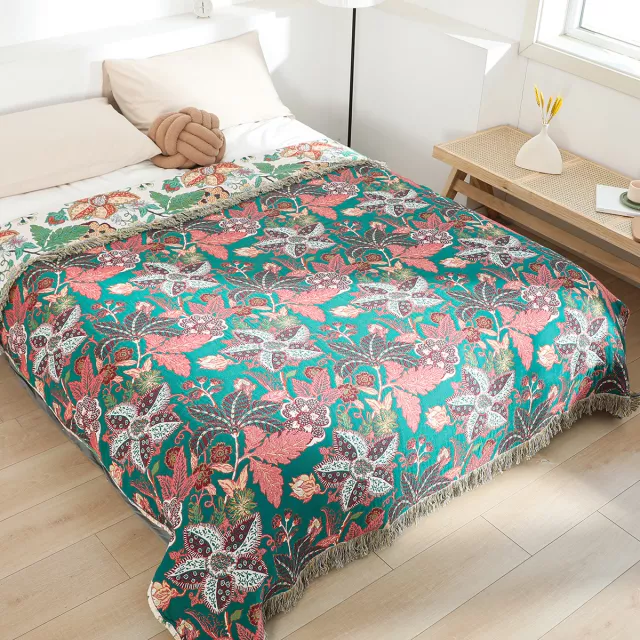 Measuring 200×230 cm, this large, rectangular blanket is the ideal size for use as a sofa cover, bedspread, or even a stylish travel companion. The double-sided yarn-dyed jacquard construction ensures durability and color retention, while the four-layer cotton gauze construction provides the perfect balance of softness and warmth.