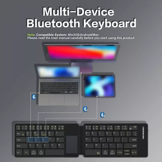The keyboard folds neatly to fit into your pocket or backpack and opens into a standard-size layout for accurate, comfortable typing. The quiet membrane keys help you stay focused without disturbing others. An integrated touchpad allows smooth navigation, scrolling, and clicking, so you can control your device without needing a mouse. The built-in holder keeps your phone or tablet at the perfect viewing angle.