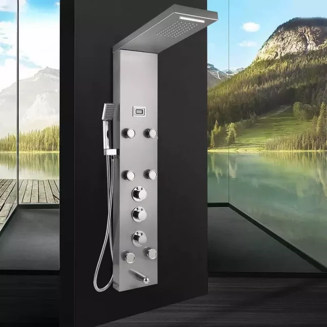 Elevate your bathroom with the Luxury Digital Display Shower Panel, a perfect blend of style, innovation, and comfort. Designed for modern living, this stunning wall-mounted shower system brings the ultimate spa experience into your home. Its brushed nickel finish and sleek stainless steel body create a refined look that complements any contemporary bathroom décor.
