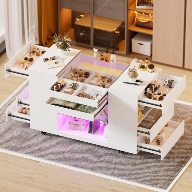 Ideal for walk-in closets, bedrooms, or boutique display areas, this multi-functional island adds both style and convenience to your space. Whether you’re getting ready for the day or displaying your favorite fashion pieces, it offers a clean, modern aesthetic that elevates any room. The bright white finish and illuminated glass surfaces bring a contemporary, airy feel to your home.