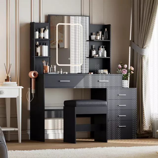Keep your space organized with six roomy drawers and convenient open shelves that display your skincare, perfumes, and accessories in style. Plus, stay connected while you get ready! The built-in dual USB ports and dual power outlets let you charge your phone, tablet, or power your hair dryer effortlessly.